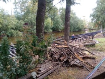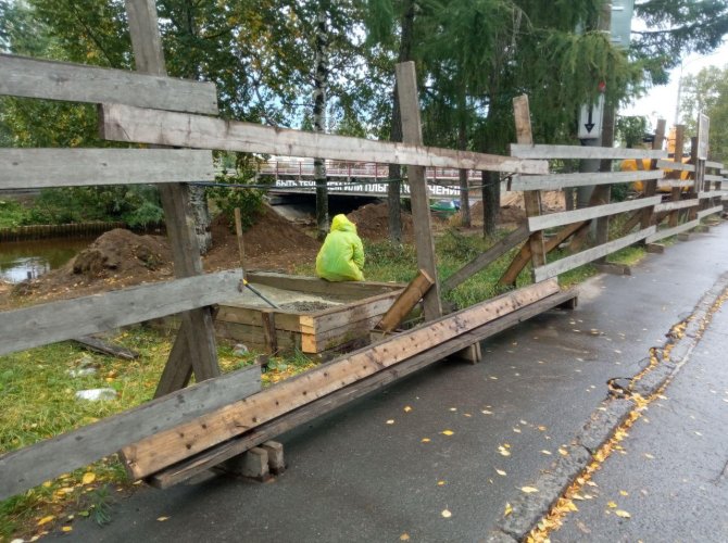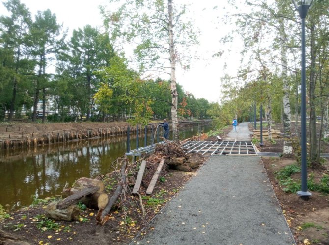 Единственное, что остается не ясным — будет ли широкий спуск к воде. Дизайн-проект обещал широкую площадку у самой водной глади, но пока основу под неё не видно. Данное решение в принципе сомнительно, поскольку уровень воды в Соломбалке постоянно меняется: осенью и весной река поднимается почти до самого променада, а летом мелеет до ручейка. В этой связи делать спуск из дерева — такая себе затея.
