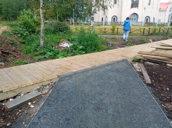 Единственная парящая дорожка всё еще медленно, но покрывается деревом, а вот к остальным тротуарам есть единственный вопрос: будут ли их асфальтировать? Если будут, то претензий нет, а, если оставят мелкий щебень в качестве основного покрытия — это проблема.