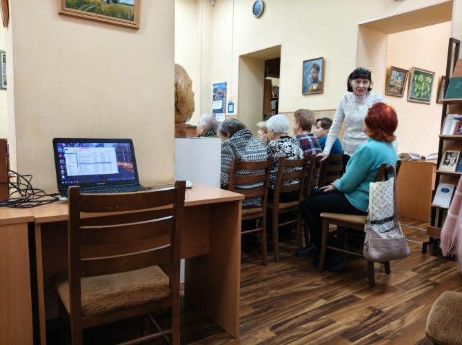Разговорившись с одной из них, узнаем, что здесь у них что-то вроде клуба по культурным интересам. Называется «Поморские жёнки». Все здесь хоть чуть-чуть да знакомы друг с другом, полная заполняемость зала — не ажиотаж по поводу китайских короткометражек, а обыденность. Библиотечные бабушки просто таким образом проводят серебряные годы: собираются с подружками, обсуждают внуков, новости за неделю, читают стихи на память, умиляются мордатым котом, смотрящим на них с картины на стене. Кто-то от скуки зависает в больничных очередях, а члены местного клуба встречаются в более приятном помещении, где общаются на более интересные темы.