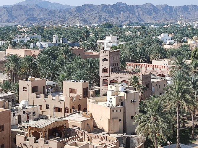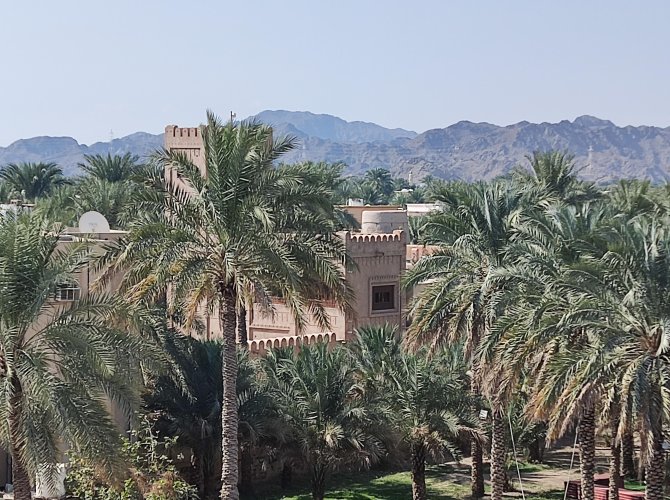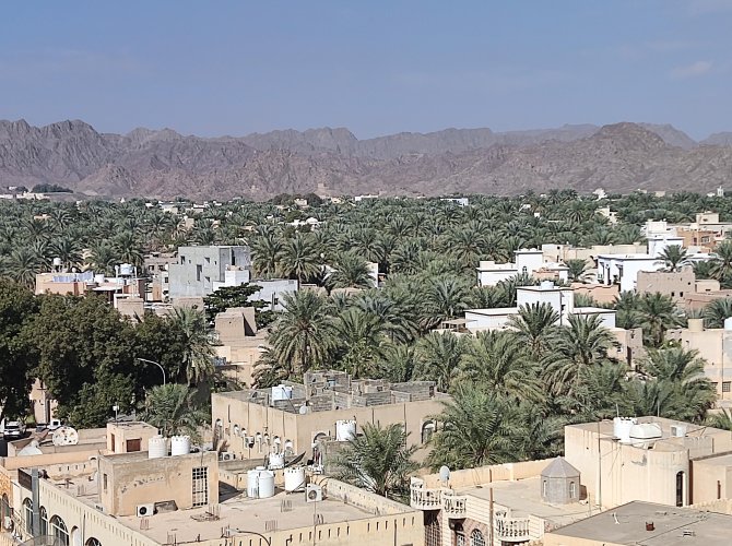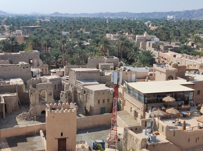И вот оно — то, что восхищает в Омане — выцветшие стены древней крепости и вид на сочно-зелёную долину. И на фоне этого буйства зелени невысокие уютные домики.