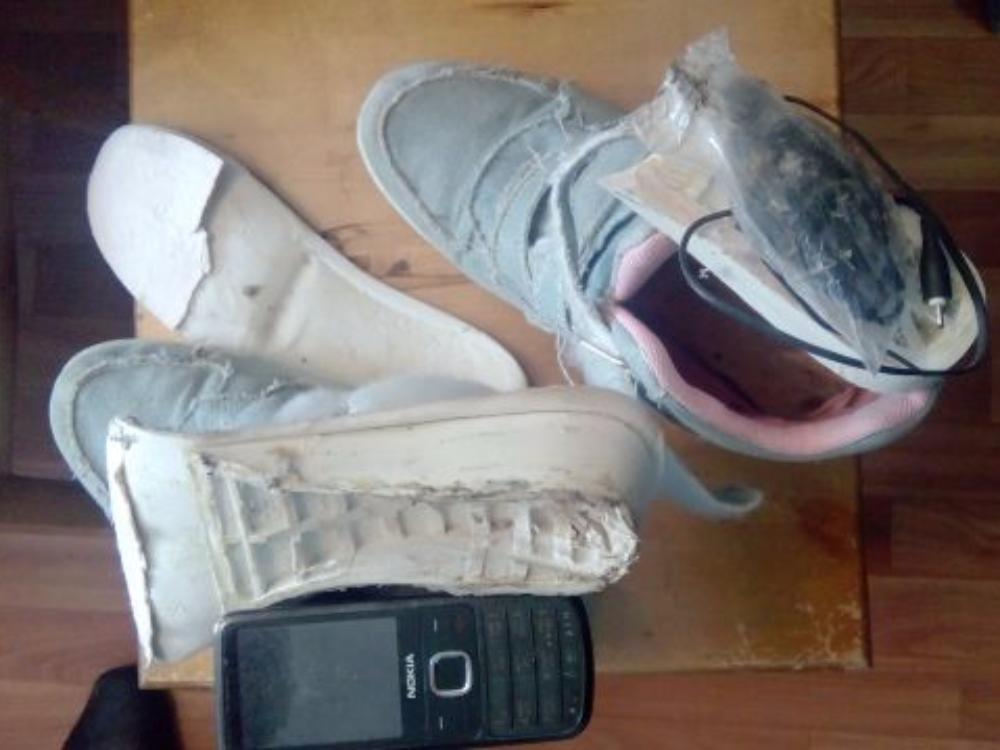 В правом ботинке под стелькой в подошве сотрудники дежурной смены обнаружили мобильный телефон, в левом ботинке под стелькой в подошве — штекер от зарядного устройства и минигарнитуру.