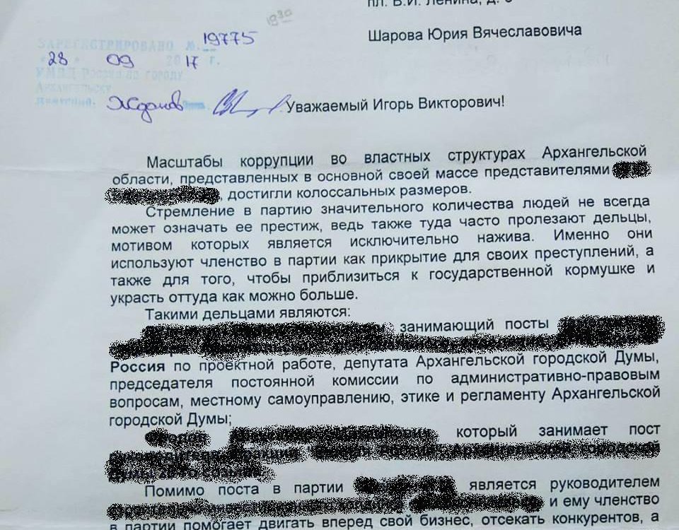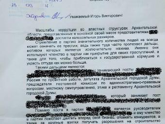 Так, в одном из них говорится, чтобы проверили ряд депутатов Архоблсобрания, ибо они пользуются прикрытием депутатского мандата для