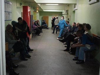 Как видно по фото дорожки уже превратились в каток, и из-за этого травмпункт города пополнился новыми пациентами. Людей набилось много. Конечно, это не самое большое колличество пациентов, бывало и больше, но уже конец дня. А очередь не уменьшается, приходят всё новые и новые пациенты…