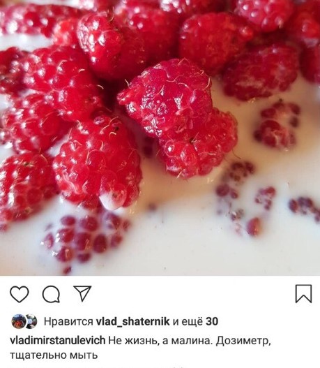 Начнем с известного политолога и православного активиста Владимира Станулевича. На своей странице секретарь фонда «Император» выложил малину и подписал: не жизнь, а малина. И тут же добавил про дозиметр и тщательное мытье.