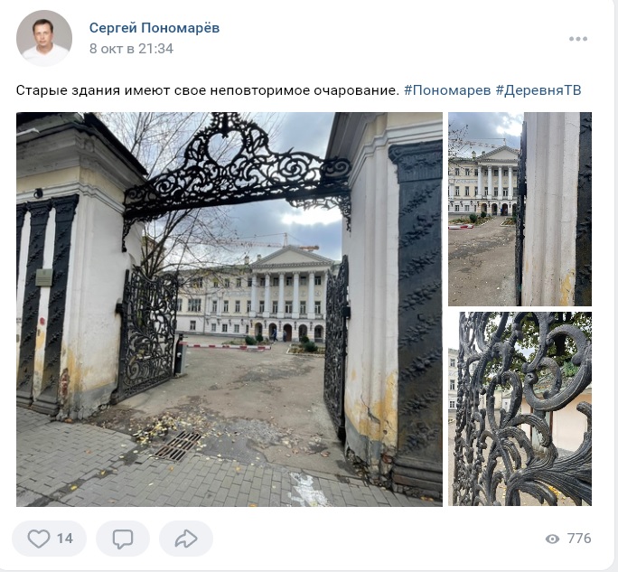 О тоске Пономарёва по родному краю свидетельствует и следующий пост на его странице «ВК». «Старые здания имеют свое неповторимое очарование», — пишет депутат.