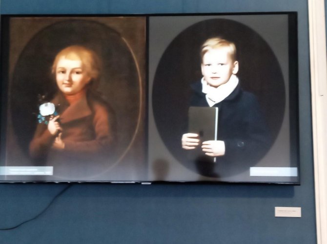 Первое, что видит пришедший в выставочный зал человек, — как раз две иконы начала 18 века. С них на нас взирают Праведник Артемий Веркольский и Спас Эммануил. Далее идёт добротный классицизм — портреты барчуков, ребятишек дворянской знати, престольных отпрысков. Жемчужина — портрет маленького Павла Петровича, великого князя, кисти художника Головачевского. Создан портрет в 1763 году.