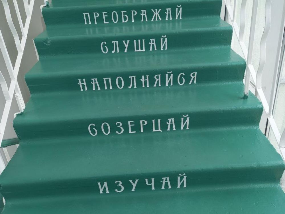 Выщербленные, сколотые ступени, унылая тёмно-зелёная краска, белые металлические перила — вот такая вот лесенка. И вместо того, чтобы полностью её менять, управленцы выбрали путь полегче — просто нарисовали гнусной белой краской на каждой ступеньке «ободряющие» призывы.
