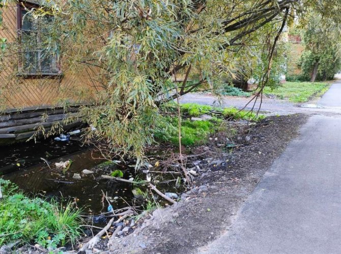 Кроме того, ещё год назад мы обращали внимание на подтопленный дом № 14. Из-за наклона тротуара в сторону здания там практически никогда не высыхает лужа.