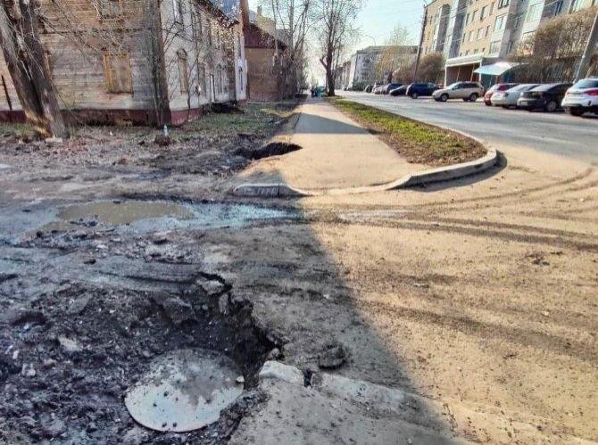 Ранее ИА «Эхо СЕВЕРА» опубликовало снимки с двумя ямищами на Вологодской улице в районе домов № 14 и № 16. Асфальт, уложенный менее года назад в рамках работ по нацпроекту БКД, пришлось «взрывать», чтобы добраться до канализационных колодцев.