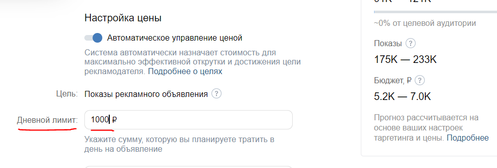 Далее заходим в расценки от самого «ВКонтакте» и узнаём, что «вкатиться» в эту историю можно со ста рублей в день, но за эти деньги соцсеть обещает совсем смешные просмотры. Десятки тысяч просмотров рекламодатель получает при ежедневном взносе от тысячи рублей и выше.