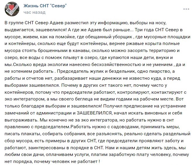 И всё бы ничего, но в самом «Севере» дела обстоят прискорбно. Во всяком случае, так считают сами члены товарищества, публикуя в группе «ВКонтакте» гневные отзывы о работе руководства. Ниже приводим характерный пост. Там всё чёрным по белому: люди негодуют и требуют навести порядок в СНТ. У граждан есть жалобы на засорённость территории и местного озера. И, конечно, классическая тема со взносами.