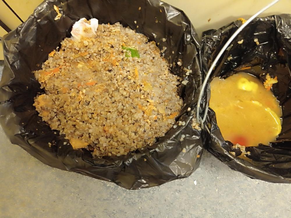 Обед: суп рассольник. Из 54 человек съели его всего 3. Остальное также пошло в помойку. Полтора ведра супа снова лились между вагонами. Ещё давали гречу с индейкой и огурцом. Отведали всё это тоже только 3 человека. Остальное в помойку. Ну хоть чай попили.