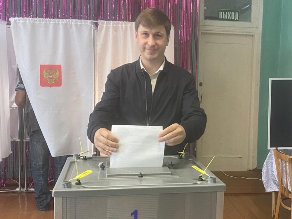 Депутат Архангельского областного Собрания Александр Фролов и депутат Архангельской городской Думы Сергей Чанчиков проголосовали на избирательном участке № 46.