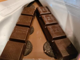 Если продукт лежал на солнце или в холодильнике, он может покрыться легким белым налетом. Бояться этого не нужно, такой налет безвреден. Чтобы избавиться от него, достаточно подышать на плитку — и налет исчезнет. К тому же, он свидетельствует о том, что в составе нет заменителей какао-масла.