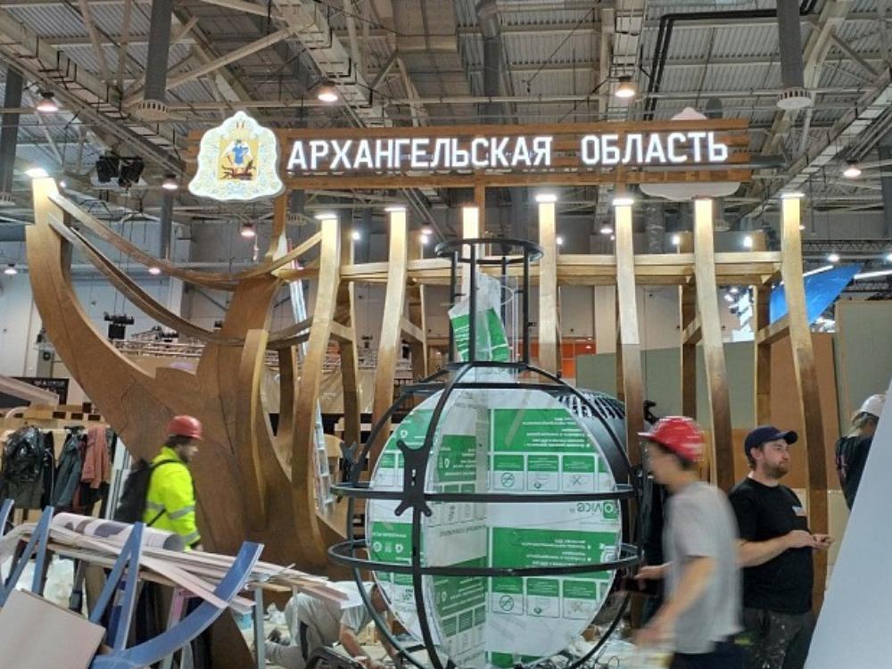 Откроется здесь и стенд Архангельской области. В настоящее время ведутся работы по его монтажу.