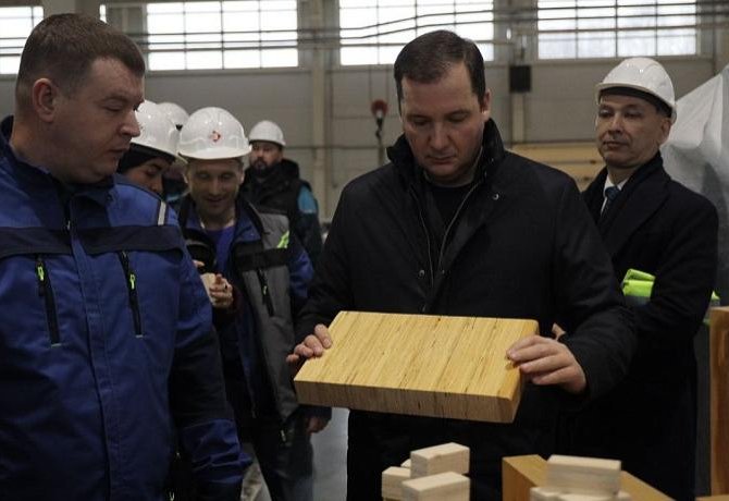 Глава региона оценил производственные мощности компании «СТОД», в структуру которой входят два завода. Масштабное предприятие уже почти 15 лет занимается изготовлением высокопрочного многослойного ЛВЛ-бруса, клеенного из шпона. Его производство ведется по технологии непрерывного прессования с микроволновым предподогревом, которая способствует лучшему проникновению смолы в древесную структуру и образованию однородного, высокопрочного материала.