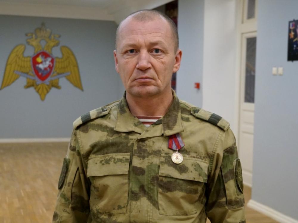 Начальник Управления Росгвардии по Архангельской области генерал-майор полиции Андрей Горбунов вручил военнослужащему ведомства старшему сержанту Андрею Райманову медаль «За спасение».