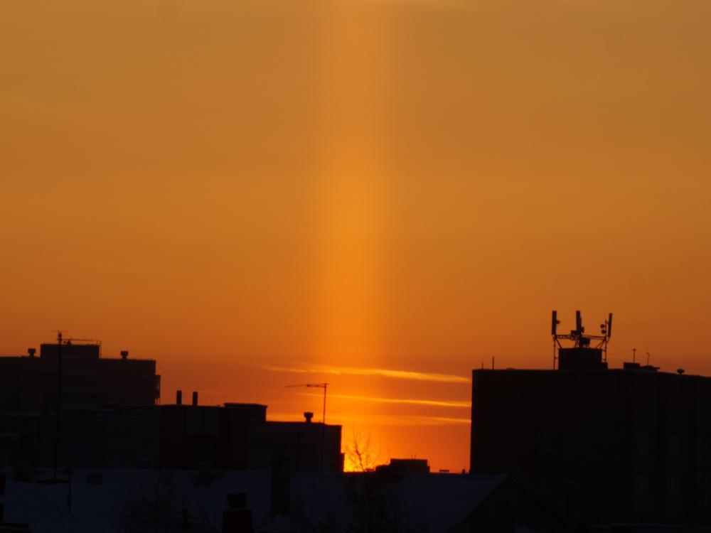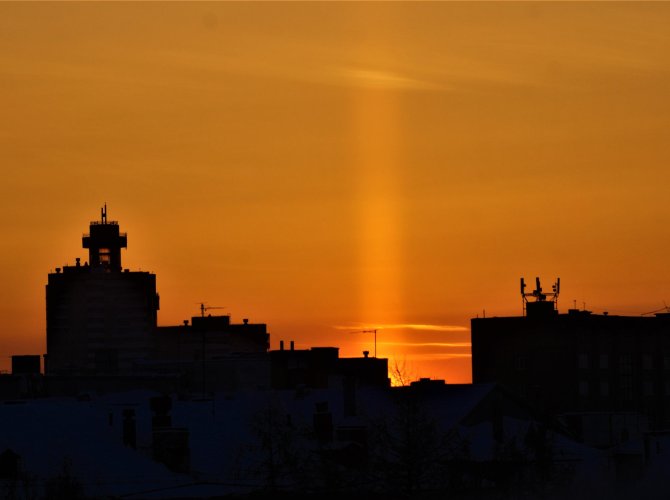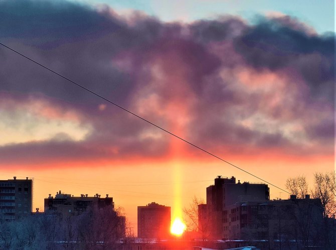 Солнечный столб в Архангельске. Февраль 2023.При низких температурах подобные кристаллы также могут образовываться и в более низких слоях атмосферы. Поэтому световые столбы чаще наблюдаются в холодное время года. При формировании светового столба свет отражается либо от верхней или нижней поверхности ледяной пластинки, либо от торцов или граней ледяного стержня.