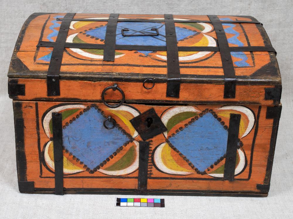 Художник-реставратор произведений из дерева Вера Чекина выполнила работы по удалению следов позднего бытового ремонта и загрязнений с росписи сундука, очистила от коррозии металлические полосы, восполнила утраты основы, тонировала потёртости красочного слоя и реставрационных дорезок, нанесла защитное реставрационное покрытие. До середины мая этот сундук посетители музея-заповедника «Малые Корелы» могут увидеть на выставке «Ларь, сундук, шкатулка», которая работает в выставочном зале (Каргопольско-Онежский сектор).