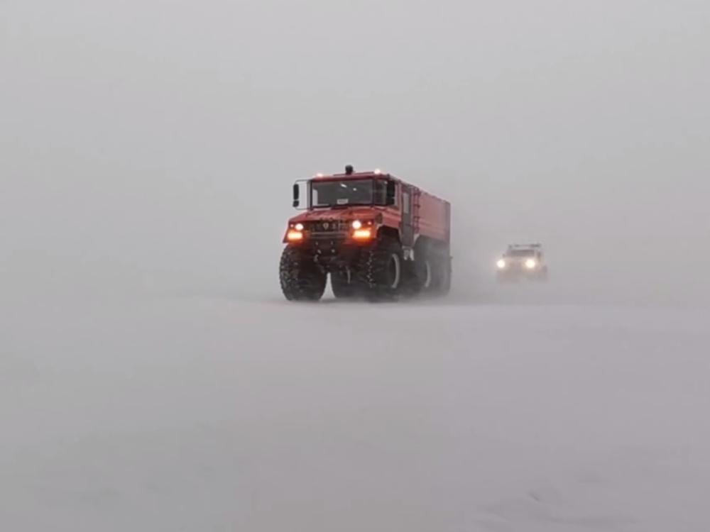 Спасатели МЧС России выдвинулись на снегоболотоходе. В снежной ловушке оказались 5 авто в районе Сенного мыса. Рыбаков в машинах замело по окна, и отправиться на зимник они не смогли.
