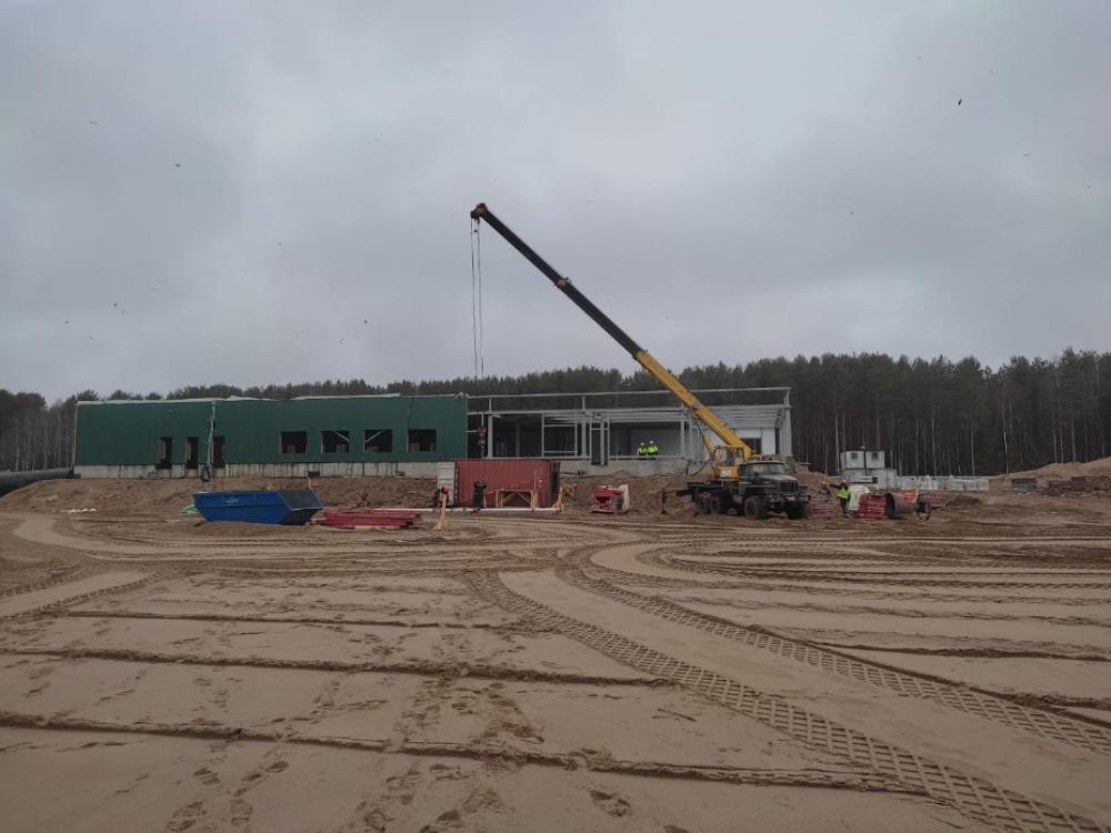 По сооружению, которое будет предназначено для хранения вторичных материальных ресурсов, на сегодня выполнена гидроизоляция столбчатых фундаментов, сейчас там ведется устройство песчаного основания под фундаментную плиту.