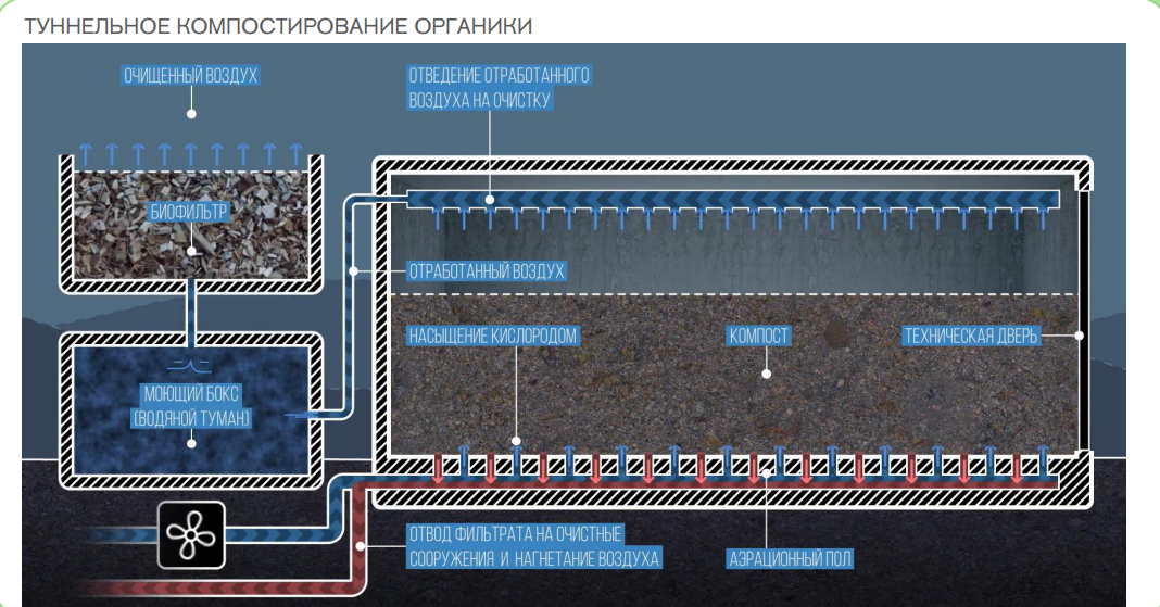 Каждый туннель будет оборудован собственной системой вентиляции, может эксплуатироваться и контролироваться независимо от других туннелей. В результате процесса туннельного компостирования получается техногрунт.