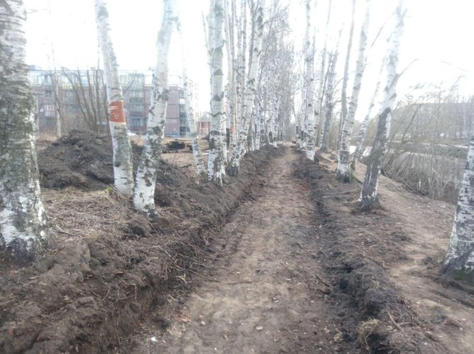 Фото: «Открытый Архангельск».Даже такая несложная работа не обошлась без косяков. Ковш экскаватора повыдергивал много березовых корней и деревья, десятилетиями растущие вдоль Соломбалки, попали под угрозу вымирания. Березкам, растущим ближе всего к траншее, не повезло особенно сильно. Кучи вырытой земли буквально пронизаны их вырванными корнями. Скорее всего, взрослые растения справятся с такой напастью, но с трудом и при условии, что их больше не будут тревожить.