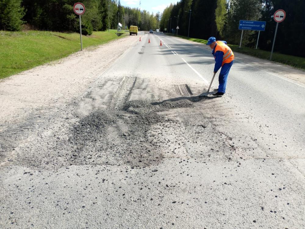 Ямочный ремонт ведется с применением горячей асфальтобетонной смеси, которую производят на асфальтовом заводе в Устьянском ЛПК.