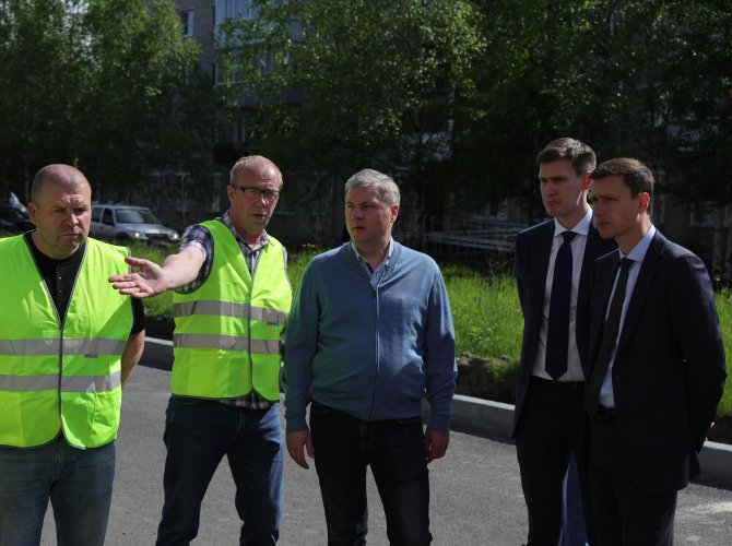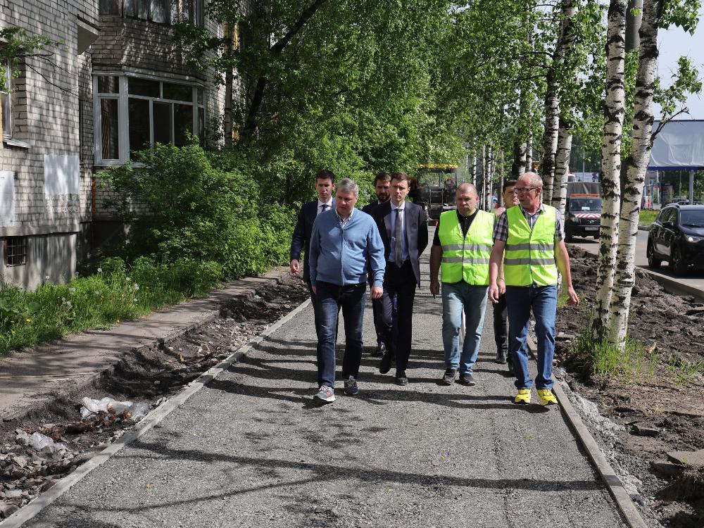 Глава Архангельска вместе с главным инженером «Автодорог» и начальником участка прошли пешком от улицы Гагарина до Воскресенской. По словам Дмитрия Морева, в таких проектах важно уделять внимание деталям: от проходов к тротуару с парковок до асфальтовых карманов для скамеек.