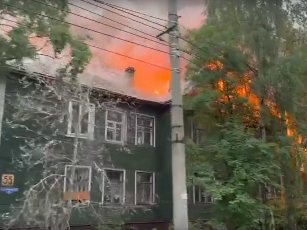 Здание горит открытым пламенем от первого до последнего этажа. Пламя вырвалось на крышу.