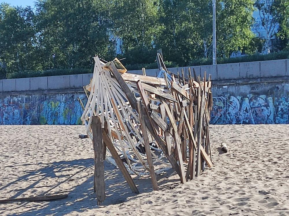 По замыслу организаторов, эта инсталляция была чем-то типа поморской лодки — то ли недоделанной, то ли обглоданной. Впрочем, неважно, как во всём современном искусстве главное не красота, а возможность додумать.