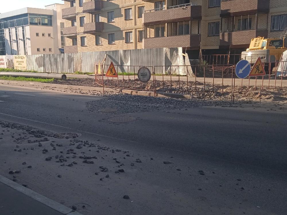 Судя по всему, асфальт пострадал после подключения третьего корпуса ЖК «Город А» к канализации. Трубу проложили, но заделывать яму как следует — не барское дело. Ответственные лица ограничились засыпкой дороги крупным щебнем и бросили.