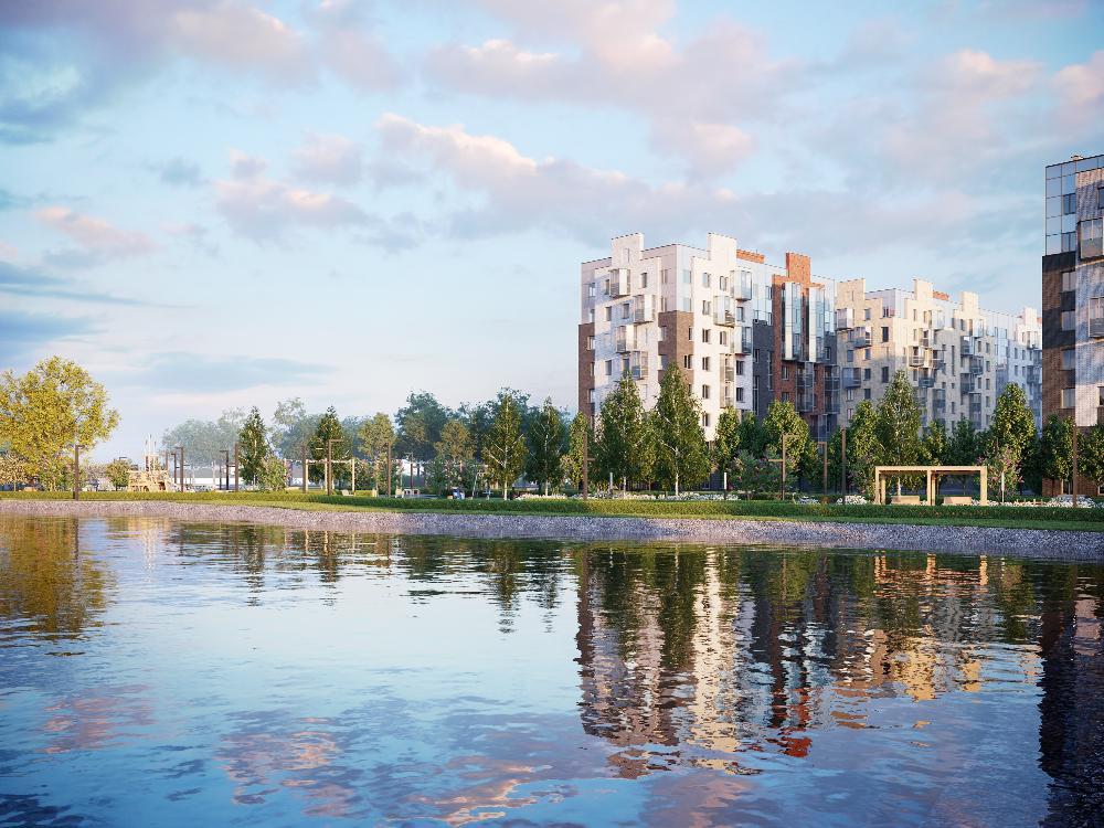 Картинка «Аквилона».Компания планирует обустроить в 15 новых комплексах двух городов 14,19 га и 13,12 га территорий с озеленением по 4,26 и 3,94 га соответственно.