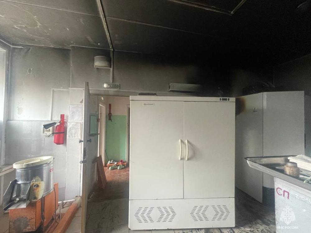 На момент пожара в здании находился один сторож. Эвакуация не проводилась. Предварительно, на кухне произошло короткое замыкание холодильника.