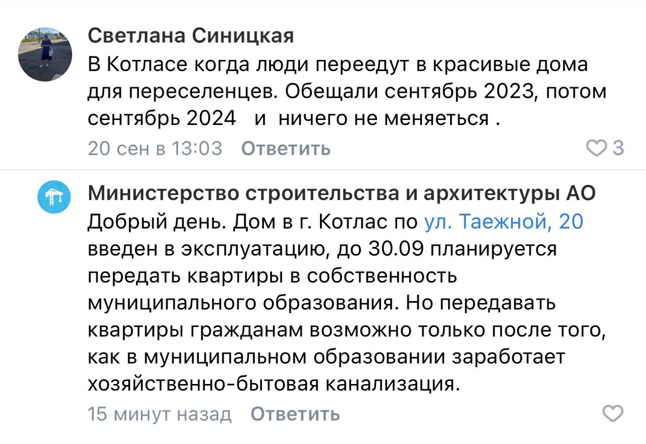 Оригинальный ответ по данной ситуации дало Министерство строительства и архитектуры АО «ВКонтакте» на вопрос жительницы Котласа Светланы Синицкой по срокам сдачи домов: