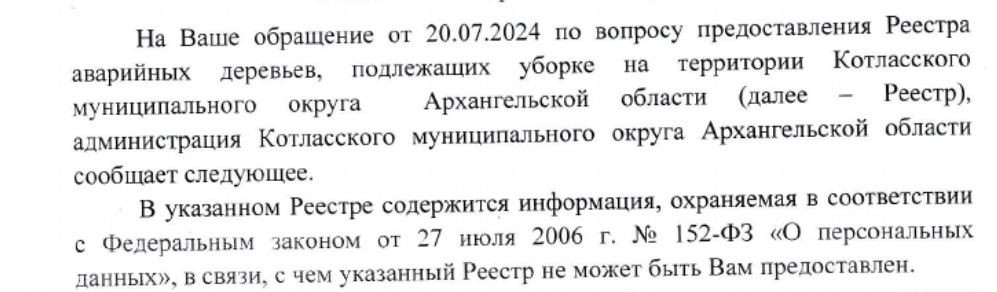 Мужчина решил поинтересоваться, как долго ему ждать и запросил перечень всех аварийных деревьев в Сольвычегодске. Ответ на фото ниже.