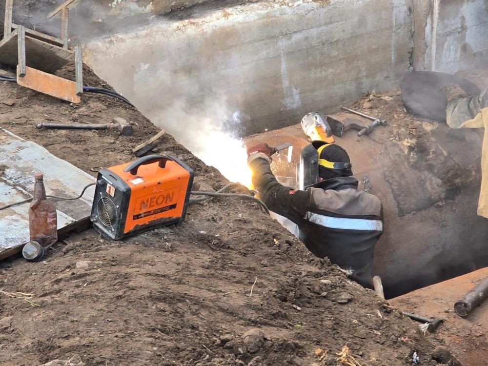 Повреждение находится в нижней части метровой трубы, поэтому для ремонта потребовалось вырезать технологическое отверстие сверху. В данный момент специалисты занимаются сварочными работами. Затем предстоит заварить технологическое отверстие, и тем самым восстановить целостность трубопровода.