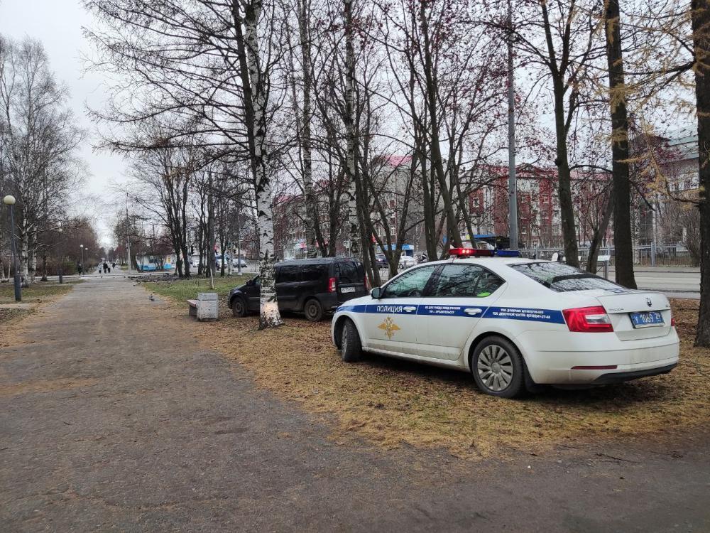 Черный «каблучок» припарковался не просто в пешеходной зоне, он заехал в аккуратно между деревьями рядом с перекрестком улицы Гайдара с Троицким проспектом, припарковавшись рядом с лавкой.