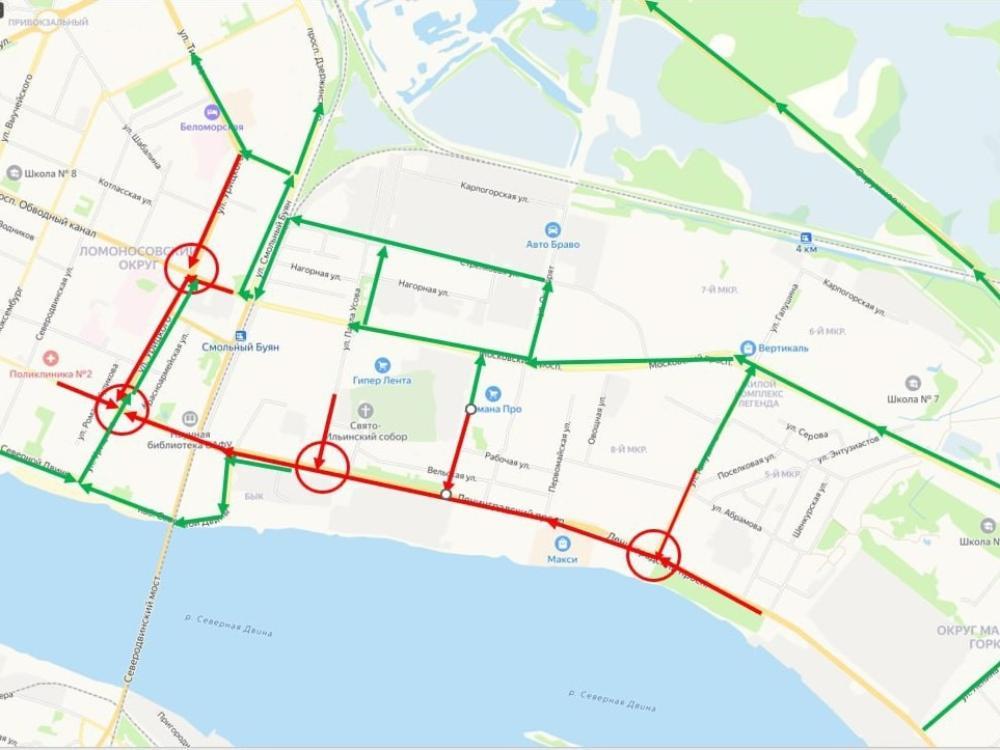По результатам мониторинга дорожного движения в утренний час пик во время перекрытия Московского выделены наиболее загруженные участки дорог (отмечены красной стрелкой), а также менее загруженные участки дорог (отмечены зеленой стрелкой).