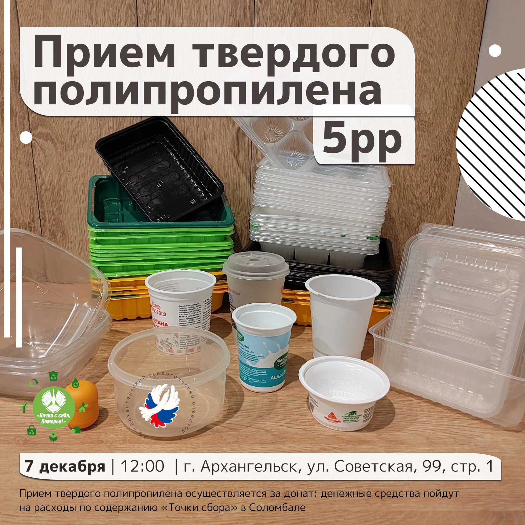 Прием вторсырья и его проверку будут осуществлять волонтеры пункта приема вторсырья «Точка сбора» в Соломбале по адресу: Архангельск, улица Советская, 99, строение 1. Акция пройдет 7 декабря, в субботу, с 12:00 до 13:00. Принимать твердый полипропилен организаторы будут за донат: денежные средства пойдут на расходы по содержанию «Точки сбора» в Соломбале. Все собранное сырье будет отправлено в Вельск.