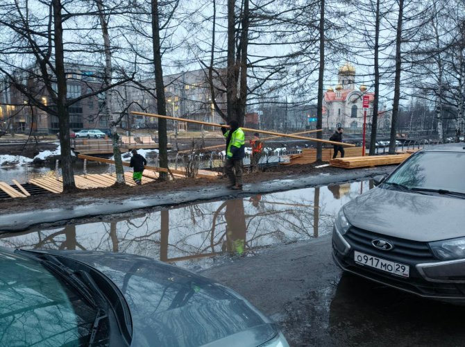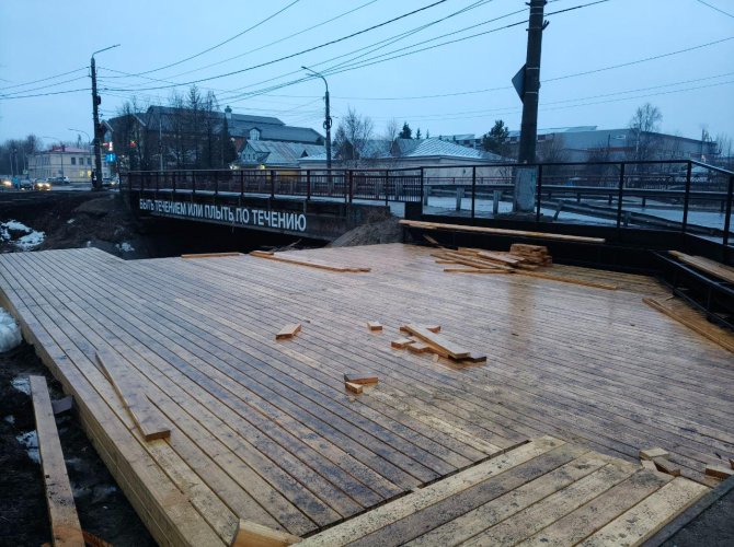 Сейчас там уже начался монтаж перил и тех самых деревянных кресел, и кажется, что эти конструкции будут только мешать при дальнейших работах, но строителям виднее. С другой стороны, красивой картинки не получается уже сегодня. Из-за разъезженных техникой тротуаров и общей слякоти по всему городу свежие доски быстро испачкались ботинками строителей. В будущем деревянная набережная так и будет устлана серыми мостками, ведь мыть их никто не собирается.