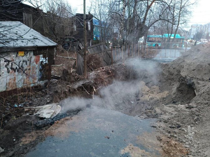 Тротуар на пересечении Советской и Терехина раскопали только на прошлой неделе, но ни в выходные, ни 2 или 3 декабря живых людей в яме встретить не удалось. Труба как парила на всю улицу, так и продолжает. Раскопки полностью закрыли единственный тротуар и теперь люди пробираются к светофору по грязной тропке.