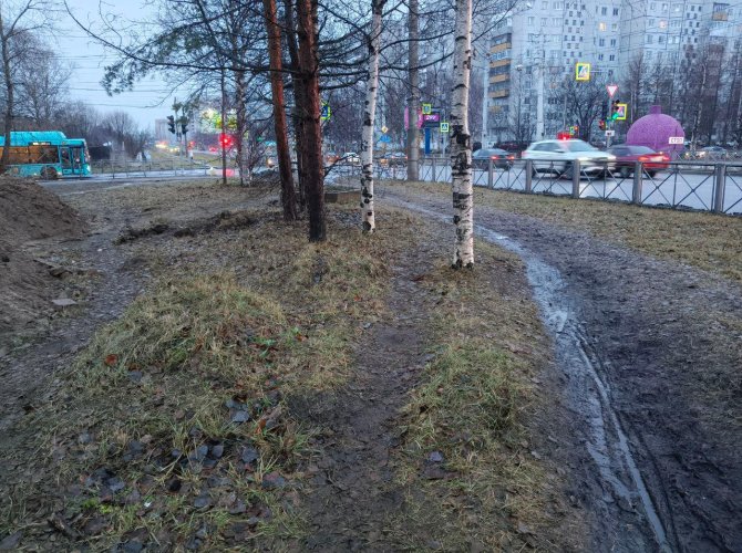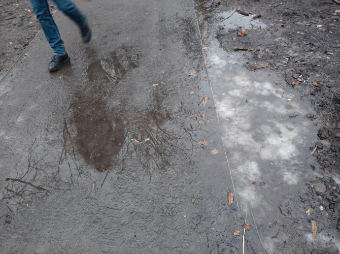 Зато есть у таких решений и один неоспоримый плюс — на деревянных дорожках заметно чище, чем в остальном сквере. Как мы и писали ранее, вода не уходит с земляных тротуаров и люди то и дело вступают в лужи, что собрались в низинах. Каменная крошка, если её можно так назвать, тоже показала себя не лучшим образом. В непогоду она превращается в обычную грязь, которая налипает на ботинки и пачкает соседнюю древесину.
