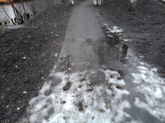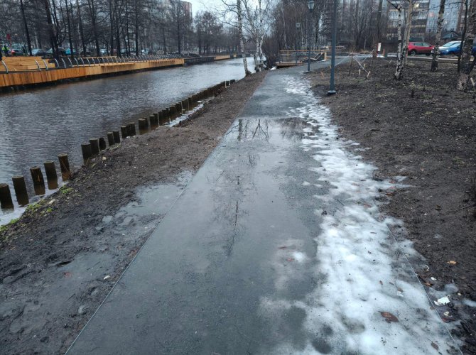 За примерами далеко ходить не надо, а именно достаточно заглянуть на противоположный берег. Там тротуары и смотровые площадки застелили досками еще в начале осени и к зиме они уже заметно испачкались, приобрели грязно-серый оттенок и кое-где пошли винтом от сырости. Сейчас это можно определить только по скрипу и слегка выступающих краях, но в будущем данная проблема станет всё более заметной.
