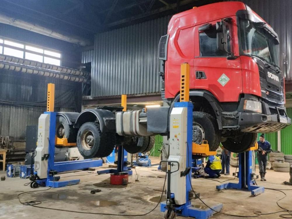 С целью самостоятельного обслуживания машин было закуплено новое оборудование: компрессорные установки для работы с пневмоинструментами, стенды для шиномонтажа и регулировки развала-схождения, 8 специальных подъемников грузоподъемностью до 7,5 тонн, а также универсальный подъемный стенд для легковых автомобилей.