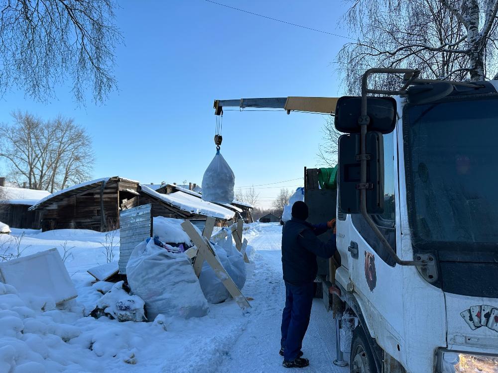 Большие мешки с отходами для безопасной перевозки переправляют на другой берег с помощью малотоннажной техники весом 5 тонн. На большой земле Архангельска мешки грузят в ломовоз, который после нескольких таких рейсов едет на полигон.