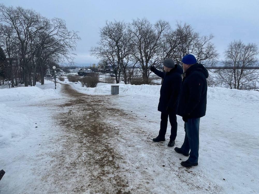 Председатель городской Думы Иван Воронцов и директор МКУ «Чистый город», депутат гордумы Алексей Бельков проверили уборку на основных пешеходных маршрутах в центральной части областной столицы.