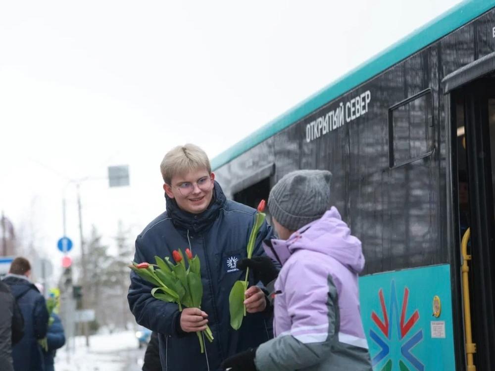 В Архангельске и Северодвинске на крупных остановочных пунктах и в автобусах кондукторы-мужчины 7 и 8 марта дарят представительницам прекрасного пола тюльпаны — цветы, символизирующие наступление весны.