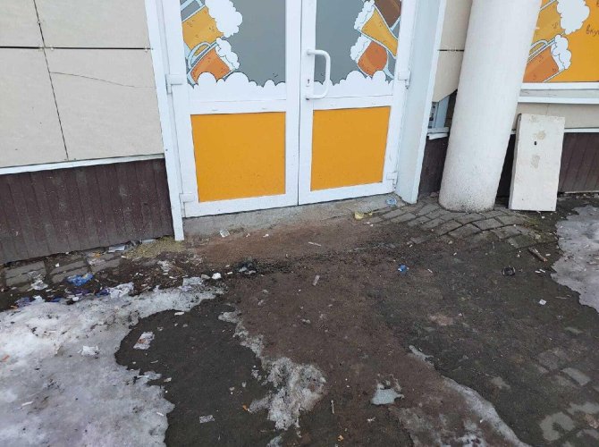 «Весь заплеванный, заржавевший, неухоженный. Собственники, наведите порядок: уберите мусор, покрасьте колонны, установите урны вместо банок, отремонтируйте тротуар и фасад — у вас плитка отвалилась и лежит вдоль стены!», — написали в пресс-службе горадмина.