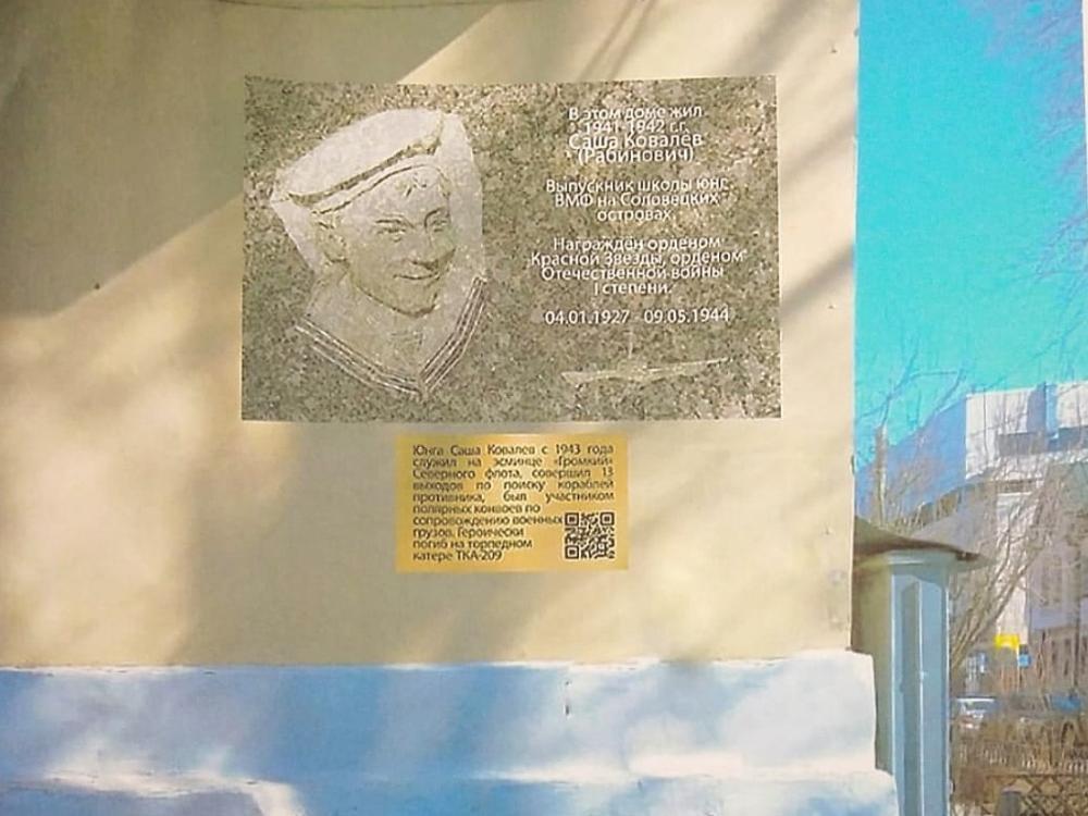 В пресс-службе администрации Архангельска пояснили, что с предложением об установке обратился центр «Патриот». Саша Ковалев — выпускник Соловецкой школы юнг, после ее окончания — участник 20 боевых операций Северного флота. 8 мая 1944 года при атаке вражеской авиации закрыл пробоину коллектора двигателя торпедного катера своим телом. Ему удалось предотвратить взрыв двигателя, но от полученных ожогов Саша Ковалев скончался.